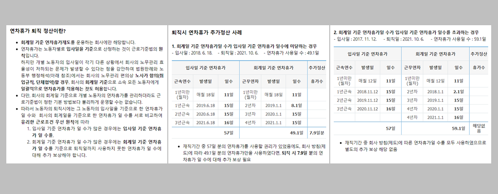 연차계산기를 이용하기 위해서는 입사일자만 알고 있으면 되는데요. 입사일을 기준으로 할 때와 회계일 기준 연차계산기가 모두 제공되고, 퇴직시 연차휴가 정산 계산기도 있으니 필요에 따라 활용 할 수 있습니다.