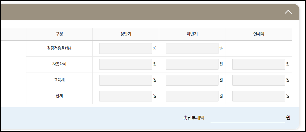 때문에 자동차세 계산기를 보면 승용차인지 아닌지, 영업용인지 여부와 함께 최초등록일, 과세연도, 배기량 등을 함께 입력 하게 되어 있는데요. 이렇게 필요 한 정보를 입력하고 나면 내 차에 적용되는 경감적용률과 자동차세, 교육세가 적용 된 자동차세 계산 합계액을 볼 수 있습니다.