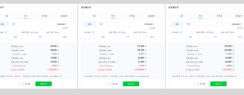 월급 소득세 계산방법도 기본적으로 비과세액을 제외한 금액을 기본으로 하며, 네이버 실수령액 계산기에서 쉽게 결과를 계산 할 수 있습니다. 과세금액 기준 월급 200만원이면 실수령액은 1,796,030원이며, 월급이 250만원이면 실수령액은 2,226,090원입니다.
