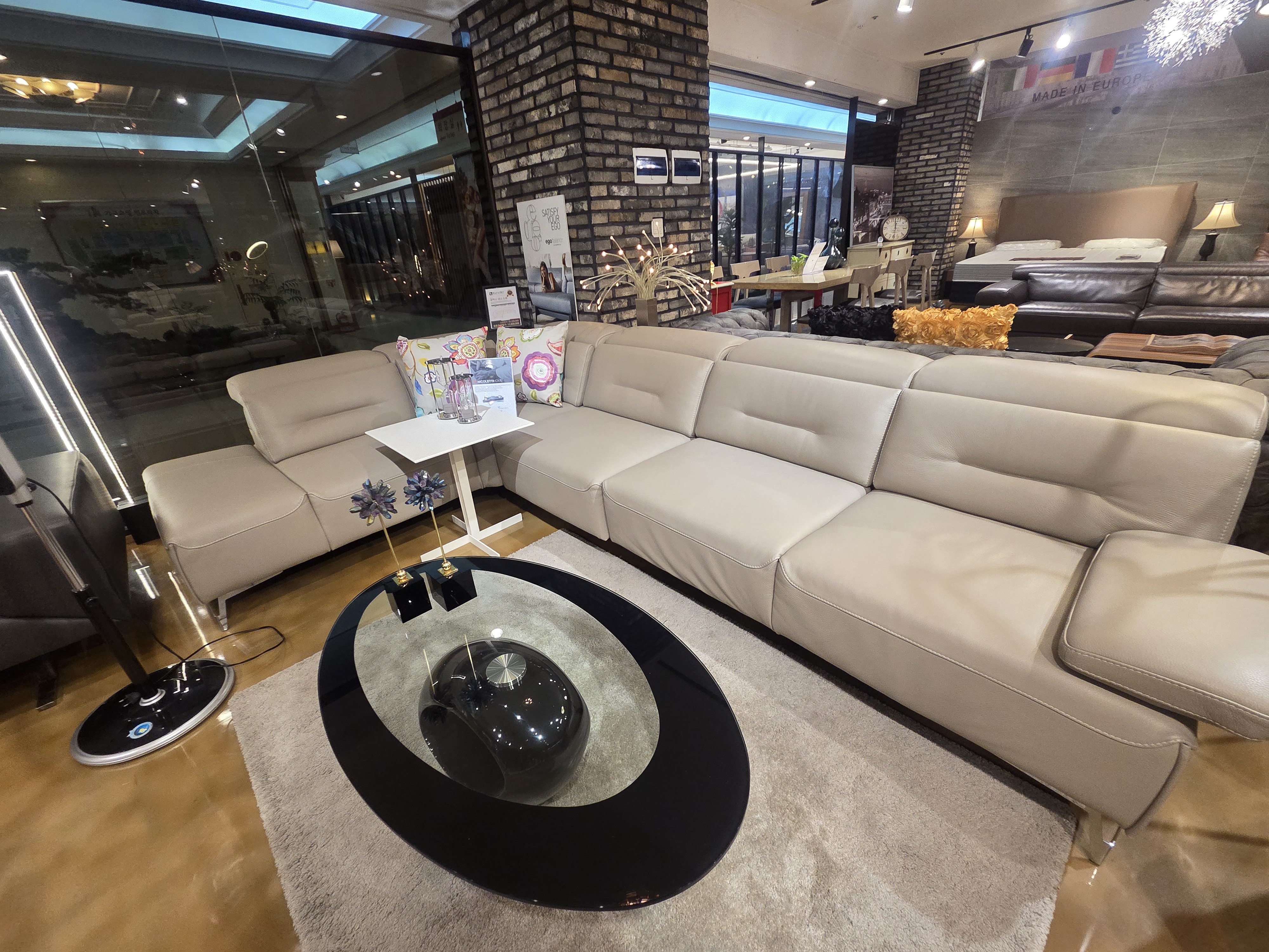 가죽도 정말 좋은데요, 천연 면피를 사용 한 소파는 앉았을 때부터 피부에 닿는 감촉이 다르거든요. 사진에 보이는 매끈함 느껴지시나요? 부드럽게 감기면서도 덥거나 차갑지 않고 땀을 잘 흡수 해 주는 동시에 시원한 특유의 촉감이 있는데, 저가 내피를 사용하는 가죽소파는 사실 말만 가죽이지 피부에 닿는 감촉은 비닐과 다를바가 없어요. 여름엔 끈적하고 덥고, 두꺼워서 앉아있어도 뻣뻣한 느낌이 들죠. 그래서 소파를 고를 때 가장 중요한 기준이 가죽 등급인데, 유로진 퍼니처는 유럽 명품가구 브랜드에서 만든 제품들이다 보니 모두 천연면피인건 당연하고, 그 중에서도 최상등급만 사용 한다고 해요. 그래서 가죽의 자연스러운 결도 그대로 살아있고, 내구성도 강하면서 만져 봤을 때 촉감도 너무 좋았어요. 해운대 가구할인매장을 다 돌아 보아도 이정도 퀄을 유지하는 곳이 잘 없는데 정말 기분 좋더라구요.